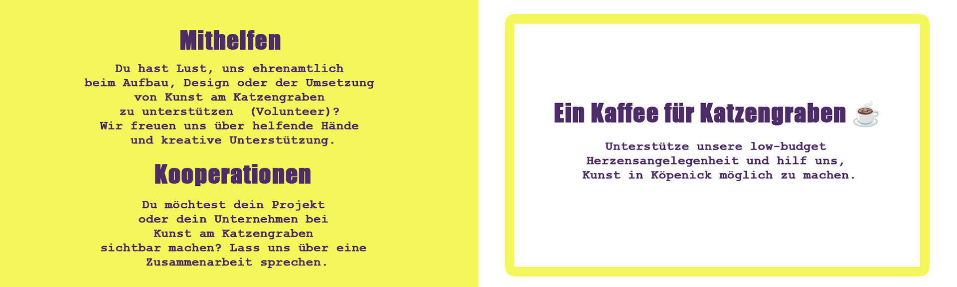 Kunst am Katzengraben versteht sich als Plattform für lokale Kunst und Community. Der Eintritt ist bewusst kostenlos gehalten – Spenden helfen uns, das Projekt weiterzuentwickeln und Künstler:innen nachhaltig zu unterstützen.